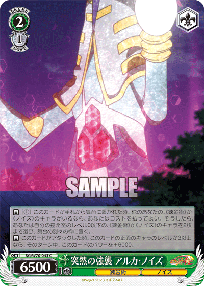 【自】[(1)] このカードが手札から舞台に置かれた時、他のあなたの、《錬金術》か《ノイズ》のキャラがいるなら、あなたはコストを払ってよい。そうしたら、あなたは自分の控え室のレベル0以下の、《錬金術》か《ノイズ》のキャラを2枚まで選び、舞台の別々の枠に置く。