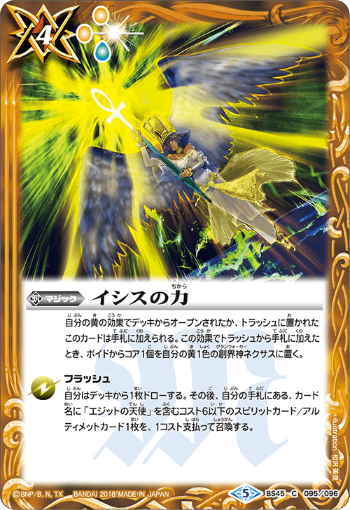 自分の黄の効果でデッキからオープンされたか、トラッシュに置かれたこのカードは手札に加えられる。この効果でトラッシュから手札に加えたとき、ボイドからコア1個を自分の黄1色の創界神ネクサスに置く。 [フラッシュ] 自分はデッキから1枚ドローする。その後、自分の手札にある、カード名に「エジットの天使」を含むコスト6以下のスピリットカード/アルティメットカード1枚を、1コスト支払って召喚する。 |