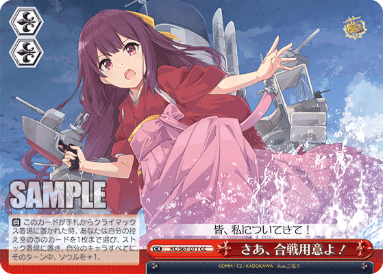 【自】 このカードが手札からクライマックス置場に置かれた時、あなたは自分の控え室の赤のカードを1枚まで選び、ストック置場に置き、自分のキャラすべてに、そのターン中、ソウルを+1。