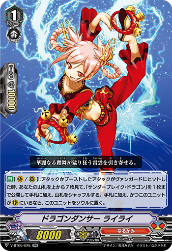 【自】【(V)/(R)】:アタックかブーストしたアタックがヴァンガードにヒットした時、あなたの山札を上から7枚見て、「サンダーブレイク・ドラゴン」を1枚まで公開して手札に加え、山札をシャッフルする。手札に加え、かつこのユニットが(R)にいるなら、このユニットをソウルに置く。
